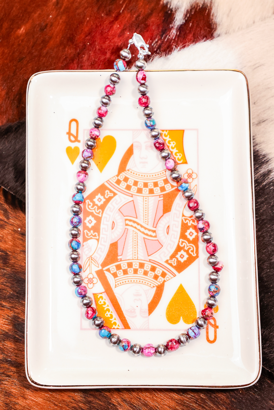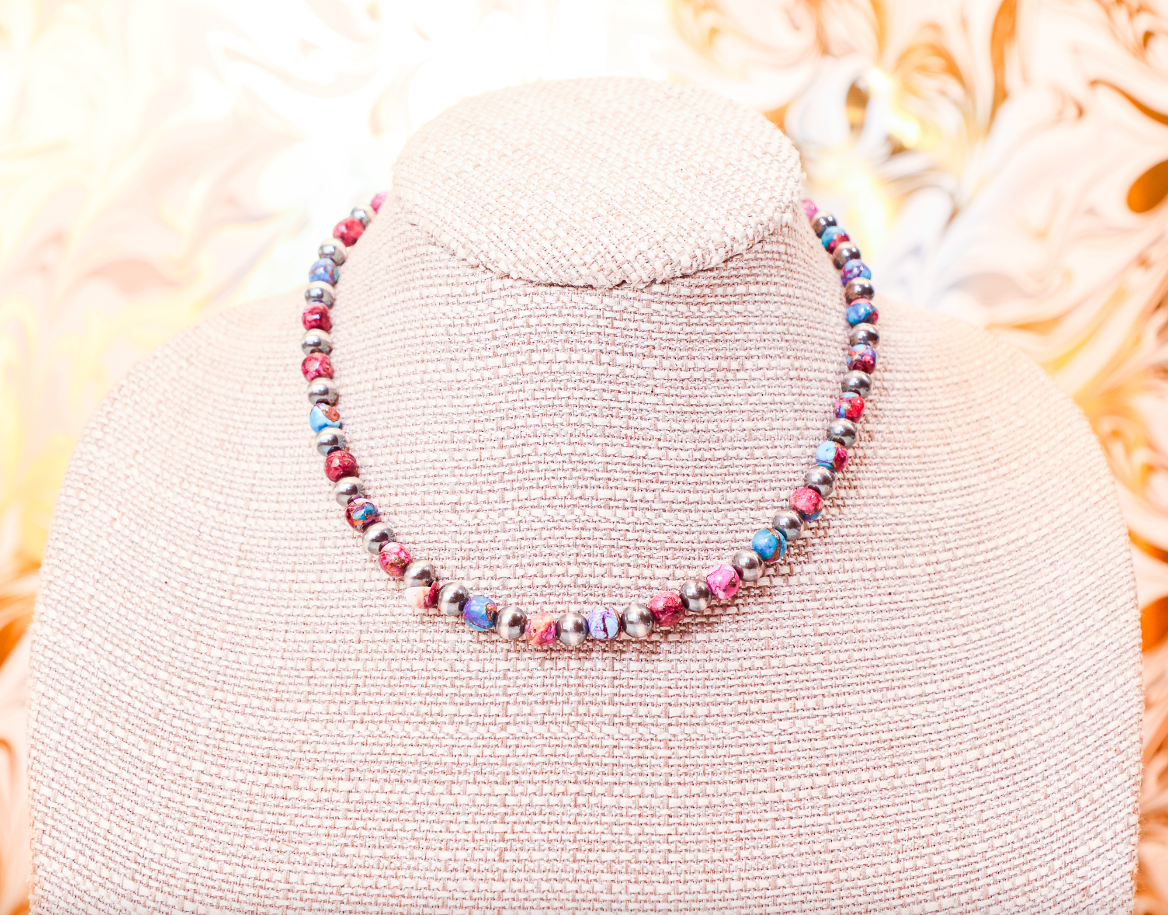 17" pink dahlia & 6mm Navajo Pearl necklace.
