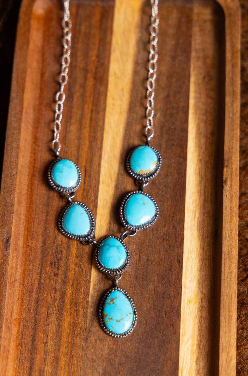 Kingman turquoise lariat necklace set in sterling silver. Handmade.