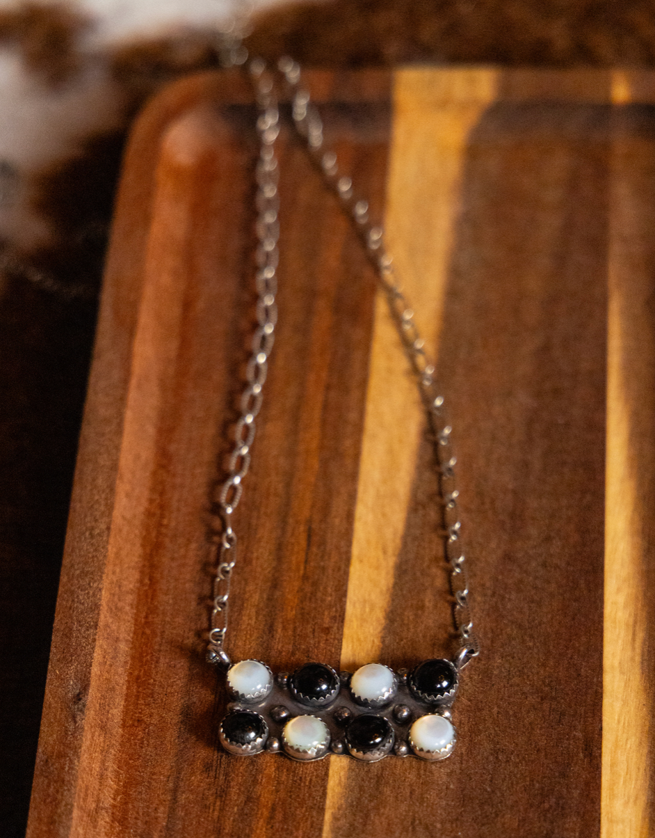 19" pearl & black onyx mixed bar necklace set in sterling silver. Handmade.